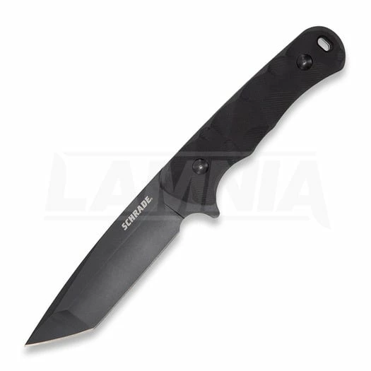 8.5″ (21.59cm) overall. 4″ (10.16cm) black finish AUS-8 stainless tanto blade. Black G10 handle. Full tang. Lanyard hole. Black synthetic belt sheath.