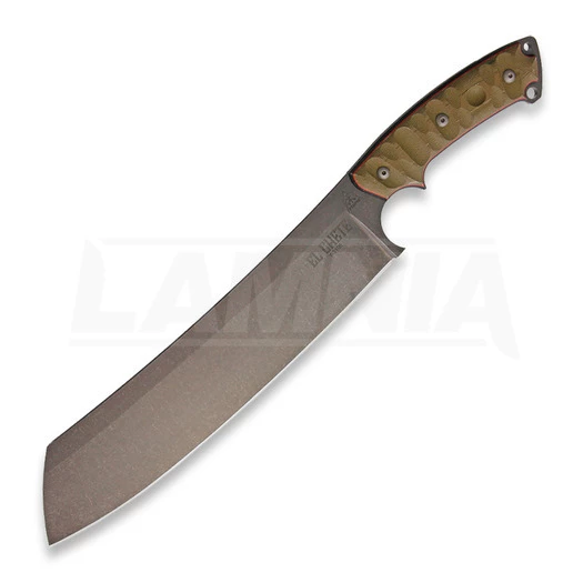 17.5″ overall. 12″ acid rain finish 1095HC steel blade. Green canvas micarta handle. Full, extended tang. Lanyard hole. Rocky Mountain Tread handle. Black Kydex belt sheath.