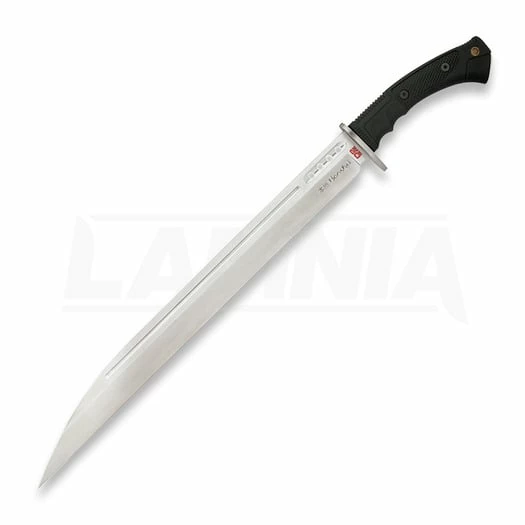 25.75″ (65.41cm) overall. 19.38″ (49.23cm) satin finish D2 tool steel blade. Black TPR handle. Stainless guard. Full tang. Lanyard hole. Fuller groove with weight-reducing thru-holes. Black leather belt sheath.